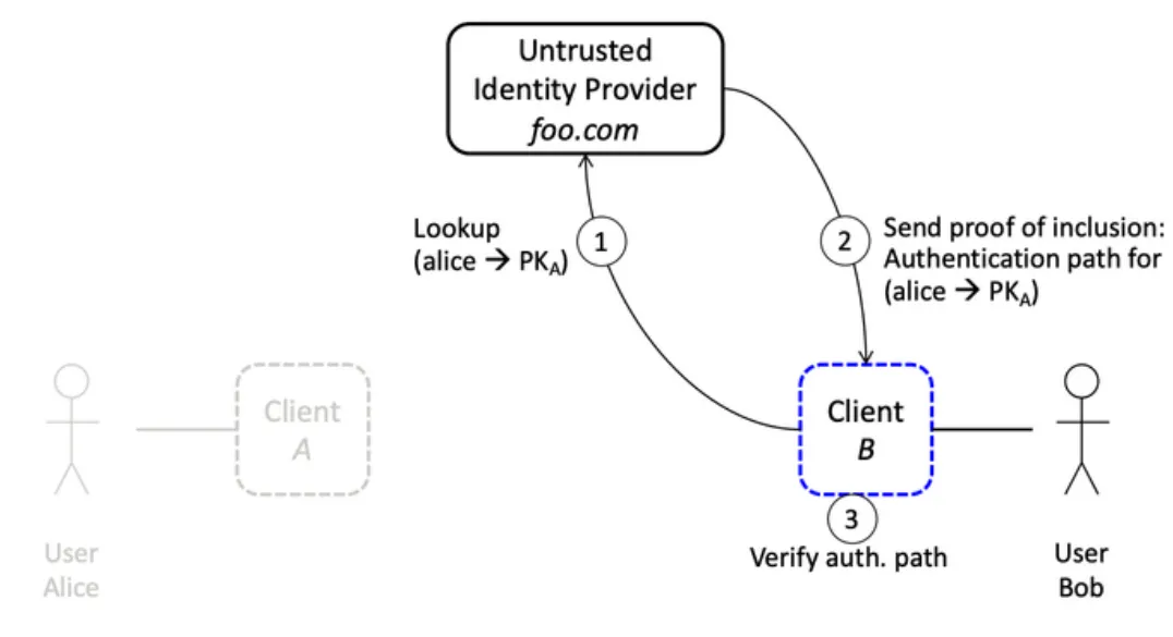We also need a map between public identifiers and public keys. The server hosting the information can be untrusted. If the information is wrong, the client will detect that when verifying the proofs.
