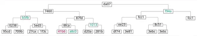 A Merkle Tree is a tree made of hashes that allows to verify that a node is in the tree. For example, to check that the tree includes the hash in red, we only need the hashes in green. Computing the hashes in a bottom up fashion with the read and green hashes should give us the same root hash.