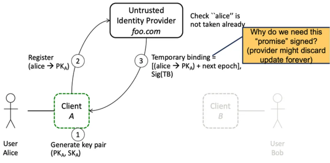 Pretty cool, right? It’s a good step forward to improve public key distribution. However, it has it’s challenges. What time interval should we use to compute epochs? What happens if a new user wants to send a message while the epoch is still building? What if clients can’t ask various providers?