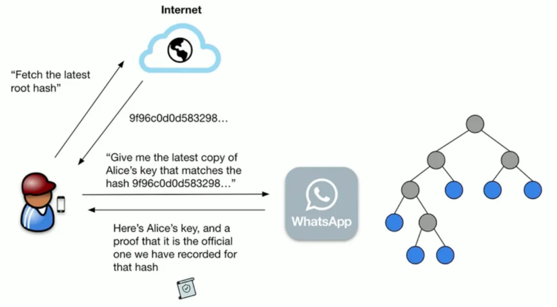 Similar to CONIKS. However, the client first asks for the root hash of the last published epoch. Then, the client asks WhatsApp for the public key included in the Merklee Tree with that root hash.