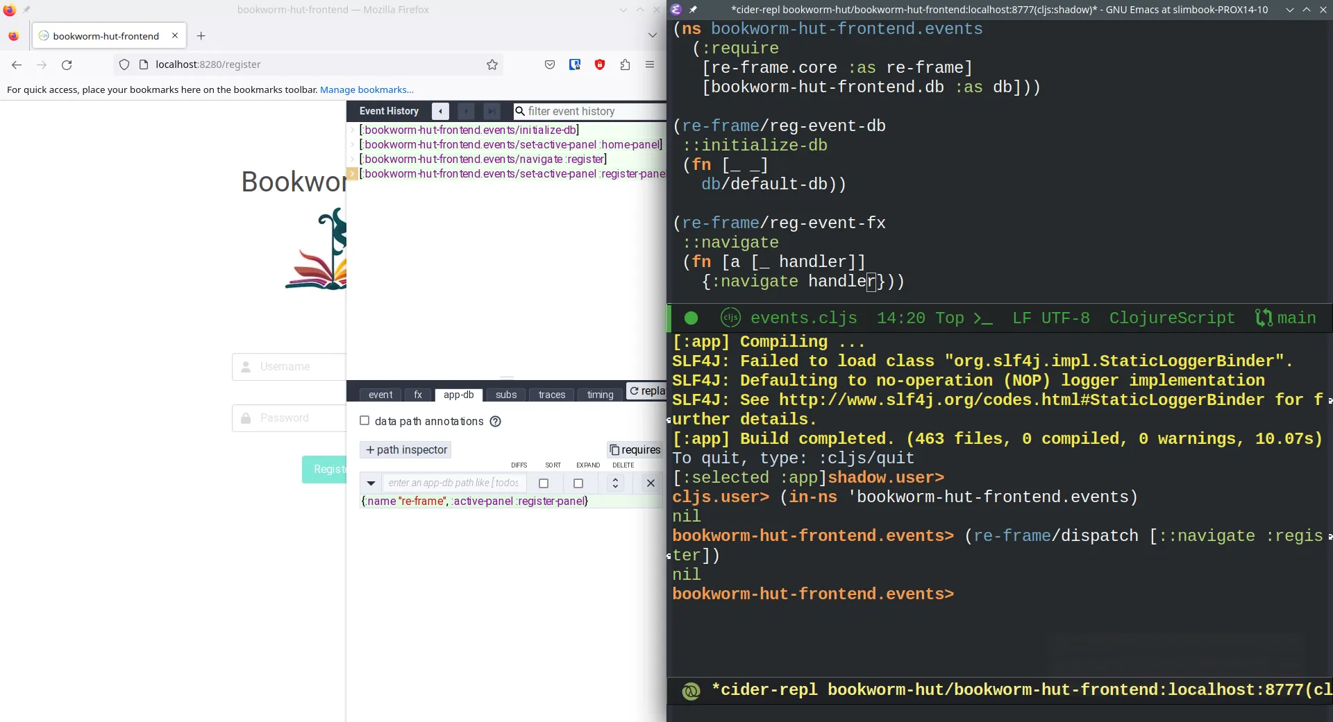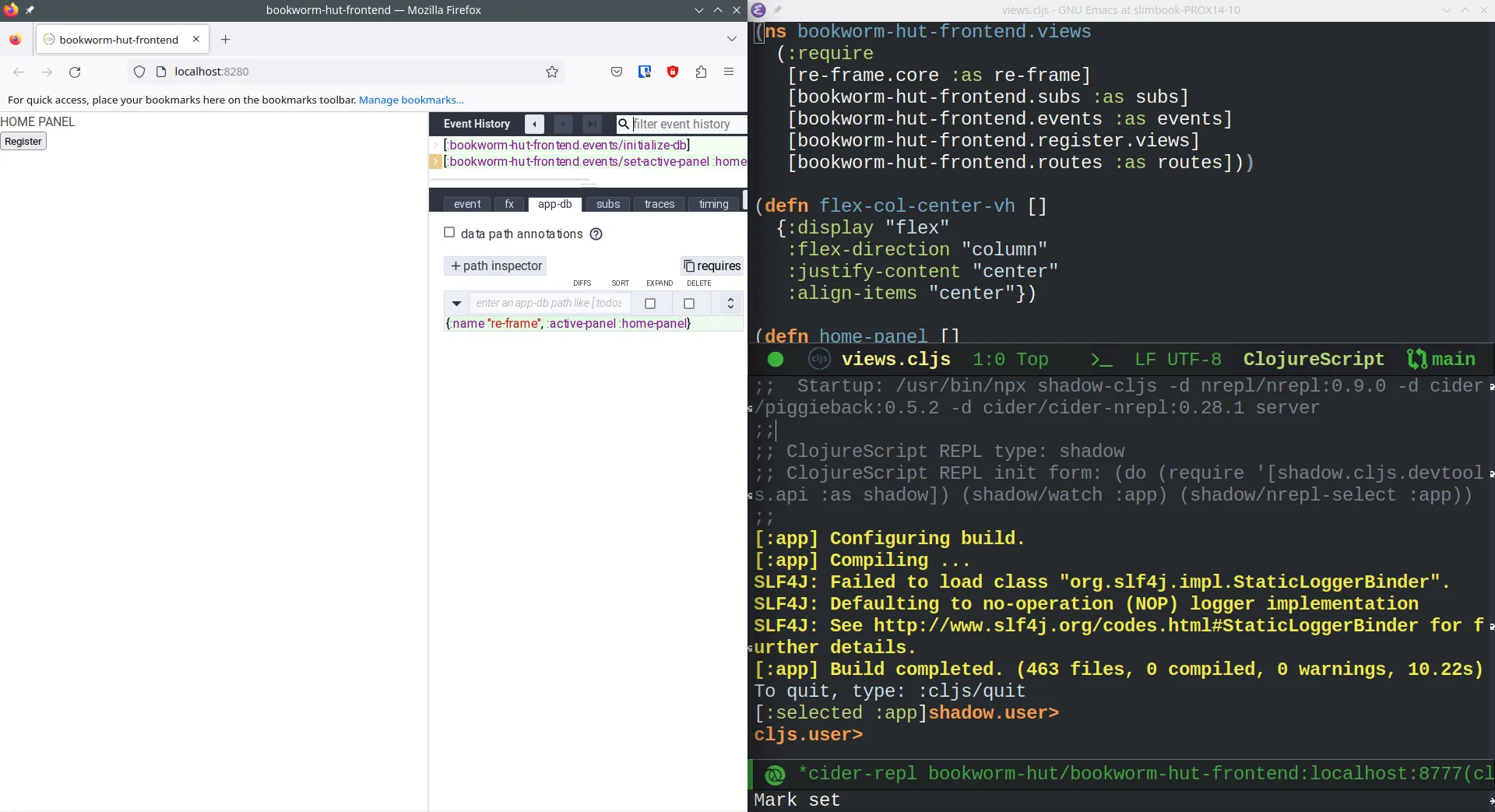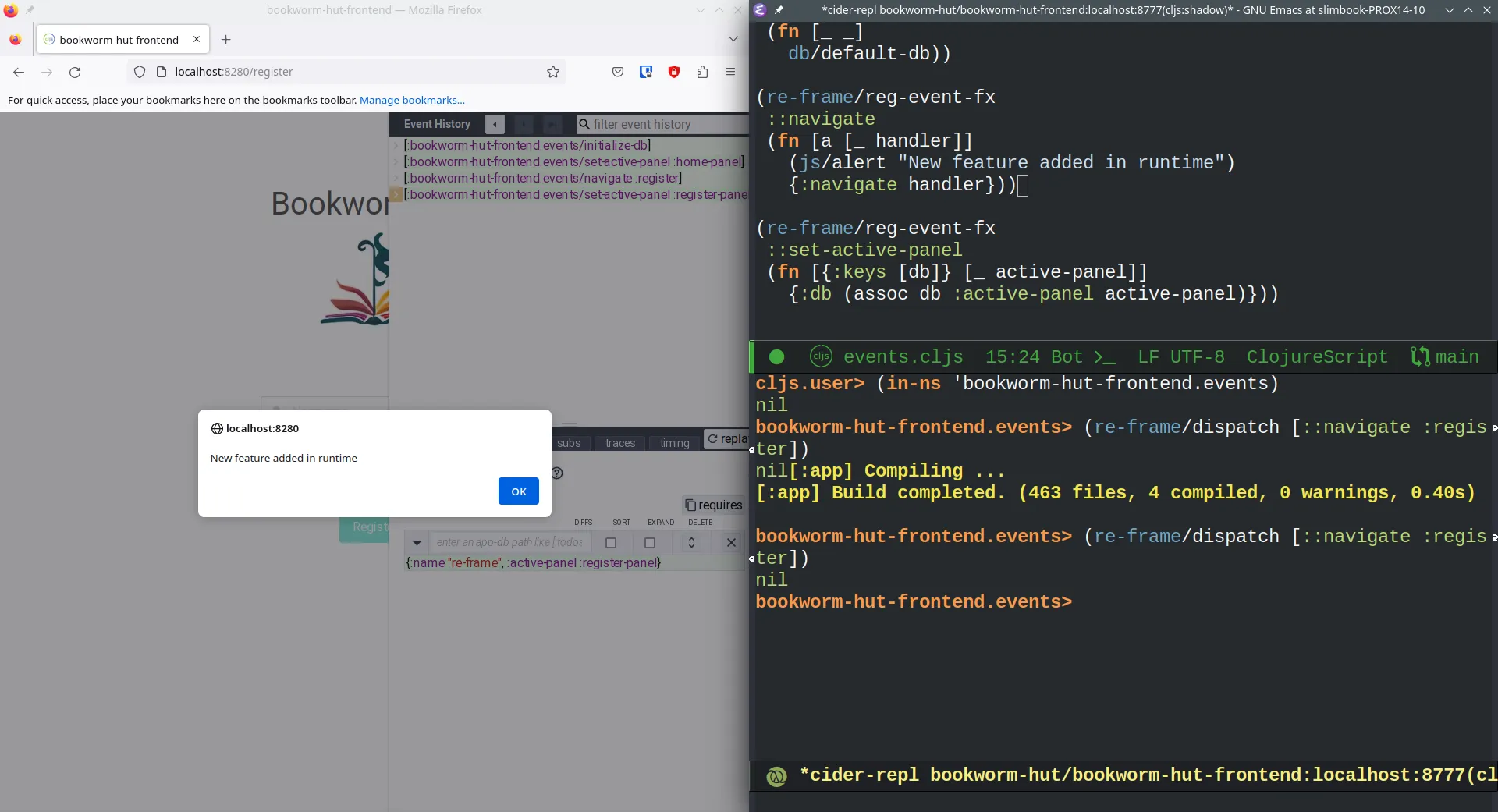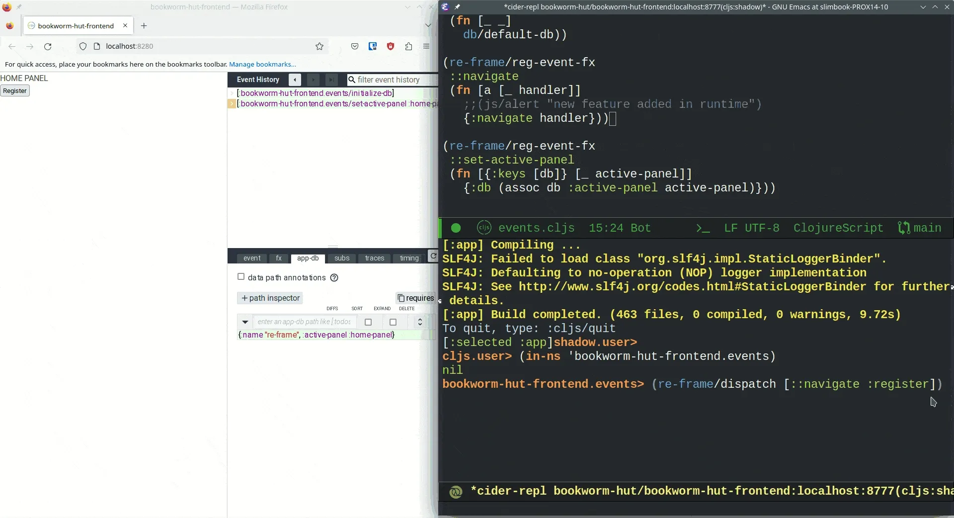 Clojure, on the other hand, is a lispy language. It was designed with the REPL in mind. We can modify our code while it is running. It may be hard to understand how powerful this is until you try it yourself. Anyway, I will try to show it to you. I have developed a simple ClojureScript frontend with two pages. You can check it out at e51f8d2 of my bookworm-hut repository. In the following image, we can see the home page, the code and the REPL session.